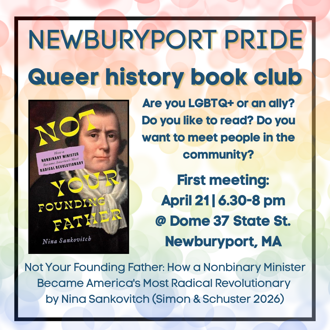 APRIL 2026: Not Your Founding Father: How a Nonbinary Minister Became America's Most Radical Revolutionary by Nina Sankovitch (Simon & Schuster, 2026) - April 21, 6.30-8 pm; Dome 37 State St., Newburyport, MA - register here!